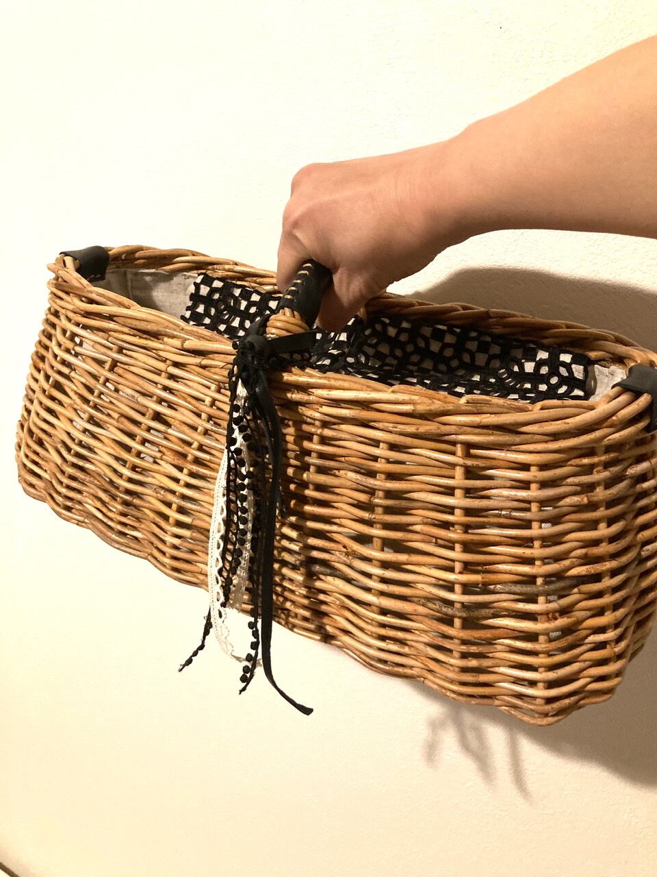 カゴバッグ正面には細いレースがナチュラルに付いています。